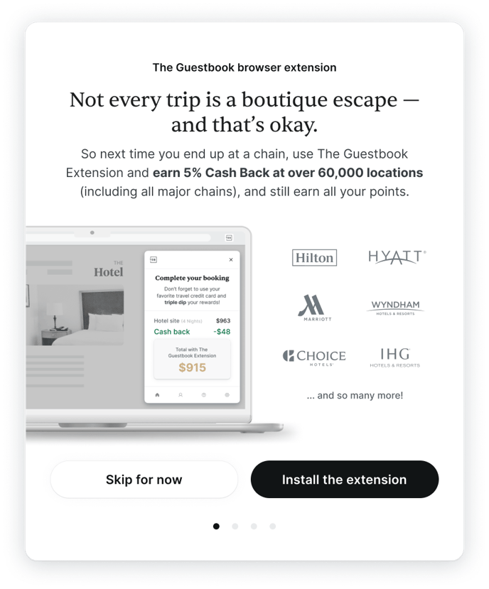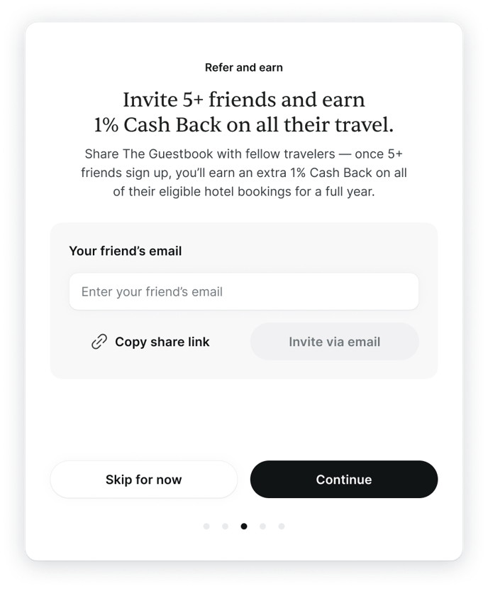 New members are now greeted with an interactive onboarding experience that explains how The Guestbook works, helps them personalize their profile, and introduces key earning features like Cash Back, Cash Forward, and optional tools such as the Browser Extension, Dining Program, and Referral Program.