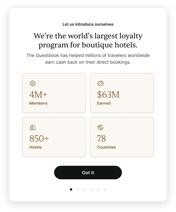 The new Member Welcome Screens help every user start strong—understanding The Guestbook’s value, connecting with our brand, and engaging with hotels in our collection from day one.