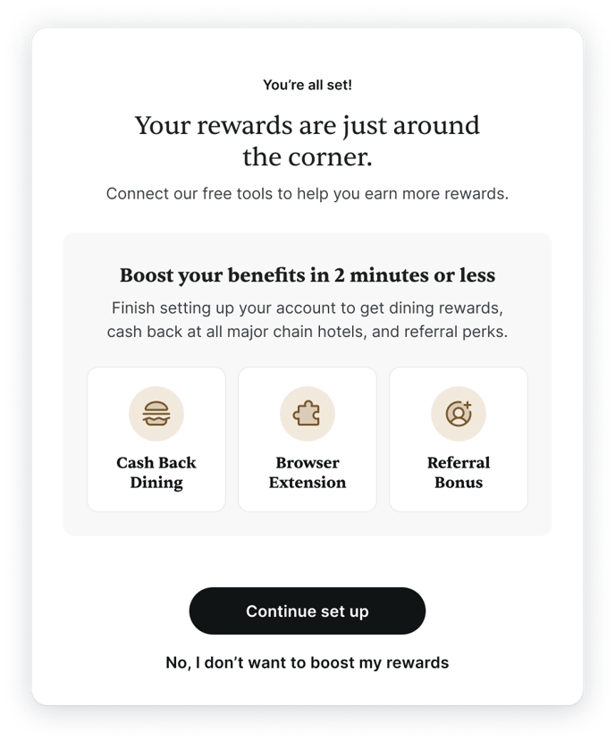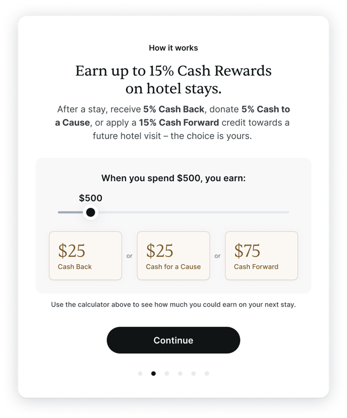 | Feature Introductions | Optional slides highlighting the Browser Extension, Dining Program (USD users only), and Referral Program. | Encourages adoption of additional earning tools, driving ongoing engagement beyond stays. |