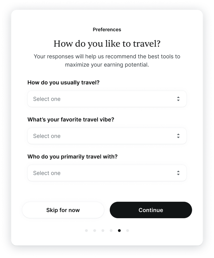Early collection of currency preferences and travel styles enables more relevant dashboard content and future communication.