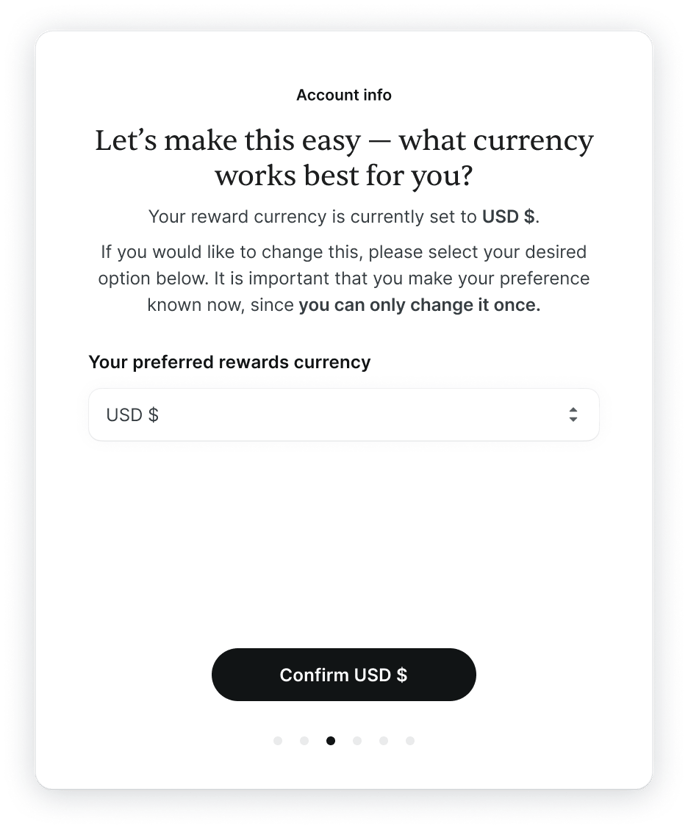 Members are prompted to confirm their email and set a preferred currency—both required steps for completing onboarding. -